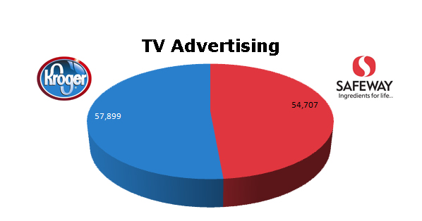 On TV, both food markets ran about the same number: Kroger's 57,899 to Safeway's 54,707 spots.