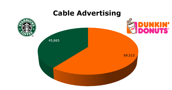 On Cable, Dunkin’ Donuts leads with 69,513 ads to Starbucks’ 45,665 in the last 12 months. September was Dunkin’ Donuts’ big month with 14,009, while Starbucks excelled in June with 19,414 ads.