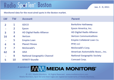 The #1 radio advertiser in Boston last week was GEICO with 861 spots. EPSON was #2 airing 598 announcements, while HD DIGITAL RADIO ALLIANCE hit #3 with 578 spots. VERIZON was #3 running 461 ads and EMPIRE LOAN took #5 with 401 spots. PLANET FITNESS dropped from #4 to #6 last week with 399 spots, while MCDONALD’S bagged #7 with 370 spots. AAA insurance jumped from #62 to #8 with 341 commercials and the NATIONAL GEOGRAPHIC CHANNEL was #9 with 328 spots. XFINITY BUNDLE was #10 with 296 spots.