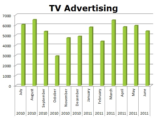 On Radio, Carmax ran the most spots out of the three media. In the last 12 months they ran 186,473 spots. Their two biggest months were April 2011 with 29,437 spots and last month, June with 29,247 ads.