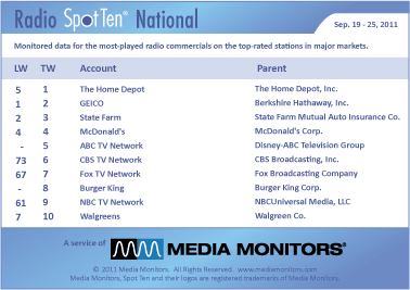 On the national front, THE HOME DEPOT is the comeback kid leaping from #5 back to #1 with 57,421 spots. GEICO was #2 down from #1 with 41,930 spots, while STATE FARM tightens the insurance game with 32,711 spots making them #3. MCDONALD’S was #4 with 27,322 and debuting in #5 this year, ABC TV NETWORK with 25,855. Of note: CBS TV comes in #6 with 23,779 ads, while FOX TV lands in #7 with 21,148 spots. NBC TV was #9 with 20,341 spots. Always great to see a new TV season begin.