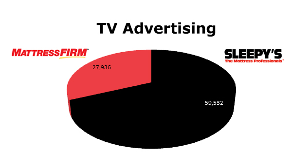 On Local Cable TV both mattress companies seem to be sleeping late. Sleepy’s ran only 13,247 spots in the last 12 months compared to Mattress Firm’s 54,751 ads.