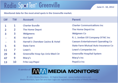 Last week in Greenville, the #1 radio advertiser was CHARTER BUNDLE running 465 spots. THE HOME DEPOT took #2 airing 453 spots, while WALGREENS landed in #3 with 316 ads. Coming in #4 was HOT SPOT (Oil Company) with 244 spots and HARRAH’S CHEROKEE CASINO & HOTEL was #5 running 243 commercials. STATE FARM was #6 with 234 spots, while LOWE’s moved #11 down to #7 with 208 spots. GREENVILLE HOSPITAL SYSTEM was #8, up from #29 with 189 units, while MACY’S soars from #49 to #9 with 188 spots. FRITO-LAY-PEPSI takes #10 with 184 spots.