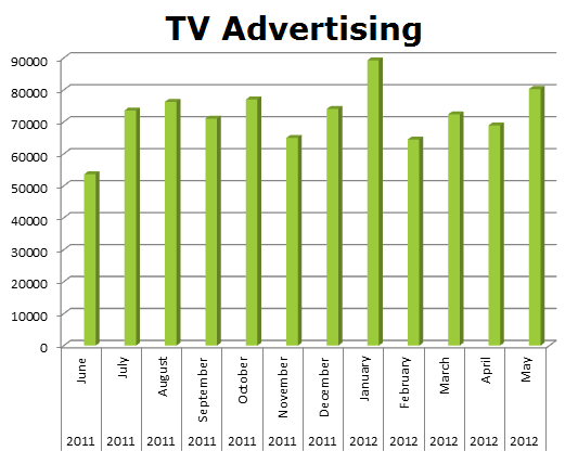 On Local Cable, Guthy- Renker ran 840,579 spots in the last 12 months. Their biggest months were last August at 82,161 units and this April 2012 with 80,286 spots.