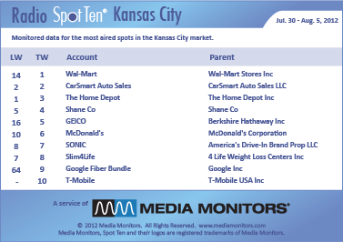 Last week the #1 radio advertiser in Kansas City was WAL-MART with 1,142 spots. CARSMART AUTO SALES came in #2 airing 595 spots, while THE HOME DEPOT was #3 running 556 commercials. SHANE COMPANY was #4 with 552 ads and GEICO moved from #16 up to #5 with 457 spots. MCDONALD’S was solidly in #6 with 426 spots, while SONIC sizzled at #7 with 425 ads. SLIM4LIFE took #8 running 406 ads and GOOGLE FIBER BUNDLE (the company's new high-speed Internet and bundled TV service) landed at #9 with 381 spots. T-MOBILE was #10 with 352 spots.