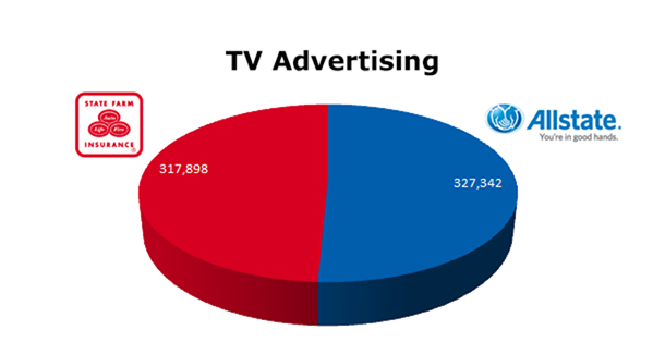 On the Radio, State Farm was way out in front with 839,526 spots, while All State ran 263,391 spots. The biggest month for State Farm was February 2013 with 83,193 and Allstate ran hottest in March 2012 with 46,903 ads.