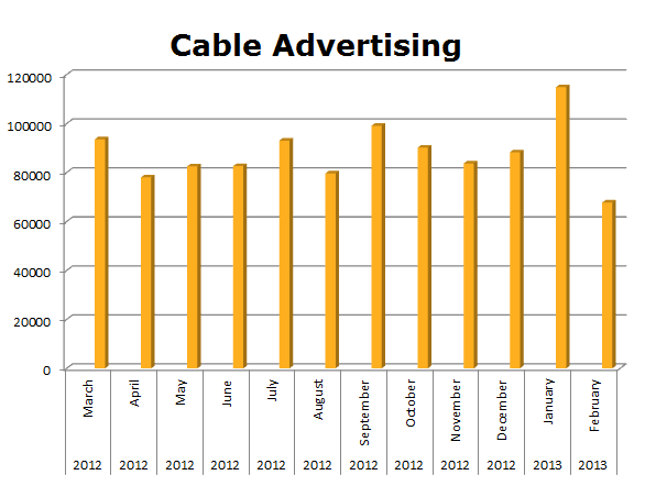 On Local Cable, Fox Broadcasting ran 1,053,073 spots in the last 12 months. Their biggest month was January 2013 when they cleared114,845 spots. 45.67% of all their spots ran on Cable.