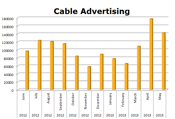 On Local Cable, Chattem ran 1,261,562 spots in the last 12 months. The most were run in April 2013 totaling 177,672 spots.